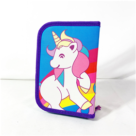 1 layer pencil case, size: 12.5*19.5*3CM, cover sequin with full printing. inside with stationery pencils, scissor, eraser, ruler, sharpner, color pencils & color markers or customerized